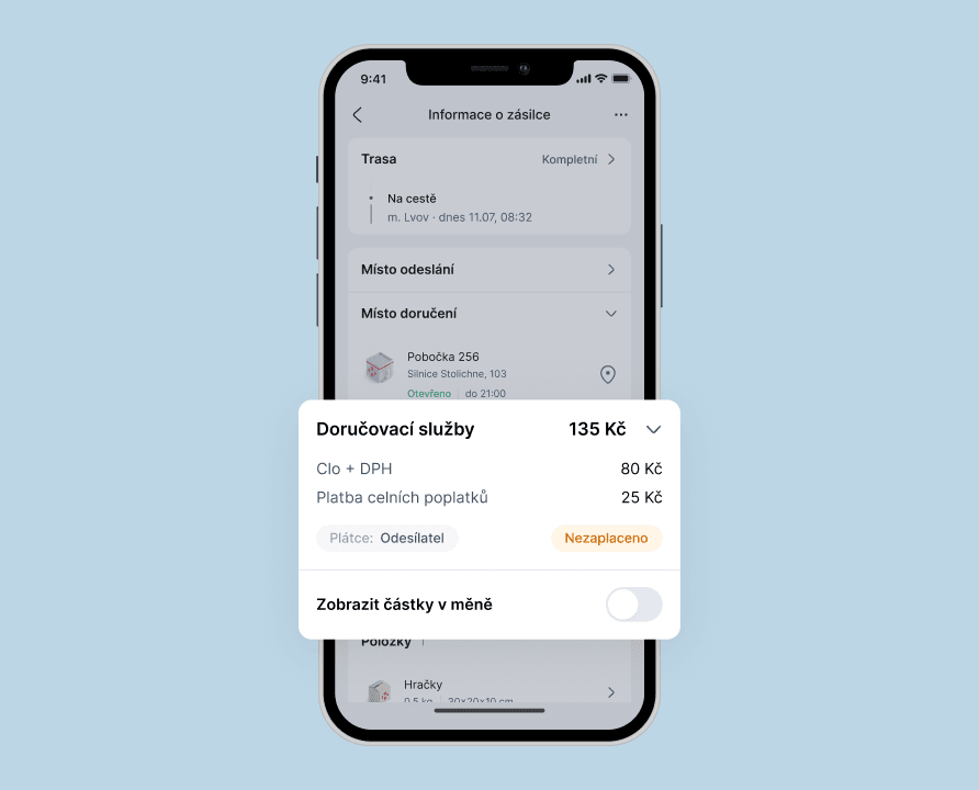 Jakmile budou celní poplatky naúčtovány, možnost platby se objeví v aplikaci v sekci „Informace o zásilce“.