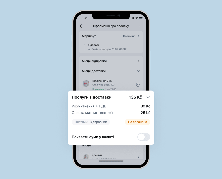 Коли митні платежі буде нараховано, можливість оплати з'явиться в застосунку в розділі «Інформація про посилку»